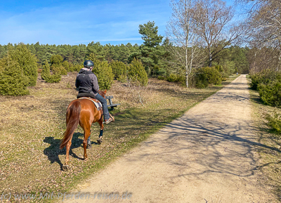 Auf unseren vier Ausritten – zweimal rund 15 Kilometer und zweimal auch an die 30 – hatten wir überwiegend naturbelassene Wege unter den Hufen, auf denen wir nicht unbedingt einen Hufschutz gebraucht hätten. Fürs Auge gab es Heideflächen, Moorgebiete und ausgedehnte Wälder, letztere auch mit kühlem Schatten in der bereits warmen Frühlingsluft.