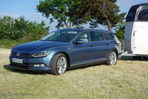 Der Passat Variant, für Mit-Pferden-reisen.de getestet in der Top-Motorisierung mit 2-Liter-Turbodiesel und 240 PS sowie Luxus-Ausstattung bis ins kleinste Detail, bietet mit 2,2 Tonnen Anhängelast, 90 kg Stützlast und 614 kg Zuladung viel Kraft für die Fahrt und Platz für Familie und Gepäck. Die Highline-Ausstattung beginnt bei 46.300 Euro. Inklusive aller hier beschriebenen Extras – hervorzuheben für Anhängerfahrten u.a. der „Trailer-Assistent“ – schlagen allerdings gut 62.500 Euro zu Buche. Also kein „Volkswagen“ mehr im klassischen Sinn…