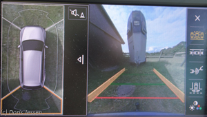 Die Rückfahrkamera hat die Anhängerkupplung voll im Blick und gibt mit grün-roten Linien den Fahrweg bis zum letzten Zentimeter unter das Kupplungsmaul des Pferdeanhängers vor.