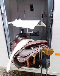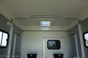 Für Pferde- und Reitequipment sind zwei Trensenhaken und an den Türen ein zwei kleinere Häkchen z.B. für Sporen oder Helme angebracht. Das reicht auf den ersten Anblick aus, verreist man mit zwei Pferden und jeweils Trensen- und Kandarenzaum oder Bosal, wären ein paar zusätzliche Haken nützlich, dasselbe gilt für die „Kleinigkeiten“. Allerdings sind weitere Sonderausstattungen gerade aufgrund der Größe des Sattelraumes kein Problem, so könnte auch eine Sitzbank, Kleiderhaken oder ein Deckenhalter eingebaut werden, wie der Humbaur-Händler Roland Paisen aus Schleswig-Holstein bestätigt.
