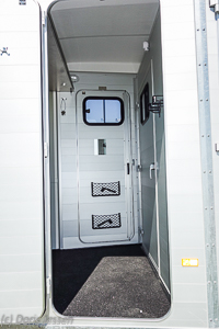 Die Größe ermöglicht nicht nur den Transport großer Pferde, auch die Kleinen – manch einer mag sich das Modell ja wegen der großen Sattelkammer kaufen – stehen aufgrund der längen- und höhenverstellbarem Boxengestänge jederzeit sicher in ihren Fächern. Zudem sind alle Versorgungsarbeiten im großzügig bemessenen Raum zwischen Bruststangen und Trennwand zur begehbaren Sattelkammer komfortabel ohne Baucheinziehen und Luftanhalten auszuführen. Im Testmodell konnten wir durch eine Tür mit Fenster direkt in die Sattelkammer (optional 906 Euro) gelangen.