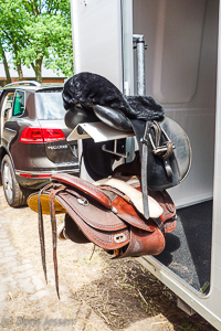 Der hier montierte Westernsattelhalter (293 Euro) ist dreh- und schwenkbar, so dass man ihn auch von außen beladen kann. Sie sind prinzipiell für große Western- und Barocksättel konzipiert, allerdings sind die lackierten Blechauflagen sehr glatt, so dass sie bei Fahrten auf schlechtem Boden und in Kurven verrutschen können. Dies wird nach Aussage des Herstellers optimiert.