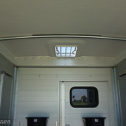 Die Rampe, die auch ein schweres Kaltblut im wahrsten Sinne des Wortes ertragen muss, ist durch vier stabile Streben verstärkt und für das sichere Einsteigen mit Trittleistengummi belegt. Links und rechts am Heck sind die Beleuchtungskörper in Seitenwandabstützen eingelassen. Dass stabilisiert nicht nur, sondern verhindert auch, dass ein Huf in irgendwelche Spalten geraten kann.