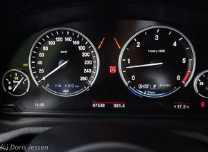 Auf allen Fahrten, vor allem aber mit Anhänger, sind die Fahrerassistenzsysteme ein wahrer Genuss: Der Tempomat hält den Abstand zum Vordermann, was vor allem im langweiligen LKW-Kolonnenverkehr auf der Autobahn die Fahrt entspannt. Die City-Anbremsfunktion reagiert –ziemlich prompt übrigens – auch auf Fahrradfahrer. Das Lenkrad vibriert, sobald man die Spur verlässt, ein Blinken im Rückspiegel signalisiert herankommende Fahrzeuge im toten Winkel und bei Nacht erspart der „BMW Selective Beam“ des Lichtassistenten das lästige Abblenden, weil das System andere Verkehrsteilnehmer erkennt und diese gezielt aus der Fernlichtverteilung ausblendet. So leuchtet das Xenonlicht die Straße knapp einen halben Kilometer weit aus, was vor allem Frauen im besten Alter entgegenkommt, deren Nachtsichtfähigkeit erwiesenermaßen mit der Zeit abnimmt. Ein spaßiges Detail bei Nacht: Die Handgriffe an den Türen sind ebenfalls beleuchtet.