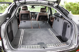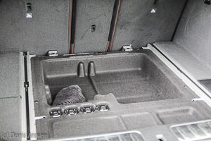 Der Gepäckraum, den wir ja als Reiter oft genug auch für Sättel & Co. benötigen, öffnet sich auf Knopfdruck elektrisch. Er ist in Anbetracht der Coupé-Form nicht riesig, aber mit 500 Litern bei aufgestellter Rückbank ausreichend. Wird der X4 durch Umklappen der Rückbank zum Zweisitzer umgebaut, werden daraus mit ein paar Handgriffen 1.400 Liter bei dachhoher Beladung. Die Fläche ist fast gerade und knapp 1,70 Meter lang. Links befindet sich ein Netzfach für allerlei Kleinigkeiten, rechts ein tiefes Staufach. Im doppelten Boden gibt es zusätzlichen Platz, auch findet sich dort ein aufspannbares Gepäcknetz, das an zwei Schienen befestigt werden kann.