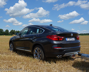 Dem Anspruch „Freude am Fahren“, den BMW seit vielen Jahren erhebt, wird das SUV-Coupé auch mit seiner Zweitonnen-Last gerecht. Die starke V6-Motorisierung mit 313 PS lässt keinen Zweifel an flottem Fortkommen auf allen Straßen, mit 630 Newtonmetern Drehmoment und xDrive-Vierradantrieb pflügt man auch auf Turnierwiesen oder Waldparkplätzen durch Schlammpfützen, die deutsche Sommerregen leider des Öfteren bescheren. Der mit nahezu zwei Tonnen Leer- und 2,4 Tonnen Gesamtgewicht schwere Wagen fixiert den Anhänger brettgleich auf der Straße. Aufgrund seines Leergewichtes darf er mit Anhängern bis zu 2,1 Tonnen zulässigem Gesamtgewicht 100 km/h schnell fahren. Bis zu 2,4 Tonnen darf er an den Haken nehmen, die Stützlast beträgt 100 kg.