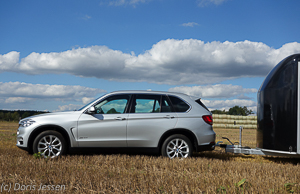 Mit seiner hohen Anhängelast von 3,5 Tonnen, dem großen Laderaum und der BMW-typischen kräftigen Motorisierung bewies sich der X5 – hier im Test das Modell xDrive40d mit 6-Zylinder-3-Liter Doppelturbo-Diesel und 313 PS – hervorragend als Zugfahrzeug für den Dreipferdeanhänger Cheval Liberté Minimax. Durch den Allradantrieb und eine dynamische Traktionskontrolle lässt er einen auch auf matschigen Untergründen nicht im Stich. BMW-typisch ist allerdings auch der Preis: ohne Extras kostet er 66.300 Euro, für die hochkomfortable Testwagenausstattung kommen noch gut 22.000 Euro dazu (Stand 2016).
