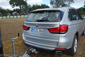 Den Pferdeanhänger am Haken, rollen wir zwischen 80 und 100 km/h im Komfort-Modus gemütlich dahin. Mit einem Eigengewicht von gut 2.200 kg und Anhängerstabilitätssystem kann uns so schnell nichts aus der Bahn werfen. Von Trägheit dennoch keine Spur: Wird man aber auf der Landstraße von einem Traktor ausgebremst, so reicht ein leichter Druck aufs Gaspedal und das Gespann schnurrt flott vorbei. Das kann gerne auch auf einer Steigung passieren, bis 100 km/h – und in kurzen Momenten auch ein wenig darüber – eine Kleinigkeit. Soll es noch etwas zügiger vorangehen werden – der „Fahrerlebnisschalter“ bringt uns in den Modus Sport oder Sport plus. Wie es sich für ein komfortables Fahrzeug gehört, hat der X5 eine 8-Gang-Automatik serienmäßig an Bord.