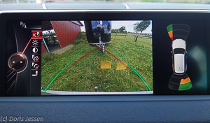Nun geht es ans Ankuppeln, das nicht nur durch eine einfache Rückfahrkamera (die hat ja nun bald jedes Fahrzeug) erleichtert wird. Diese Kamera bietet zusätzlich eine Zoomfunktion, die den Kupplungskopf und damit auch die sich langsam nähernde Anhängerkupplung zentral ins Visier nimmt. Die Entfernung zur Anhängerkupplung kann mithilfe zweier statischer Kreissegmente abgeschätzt werden, eine vom Lenkeinschlag abhängige Linie hilft, das Ziel genau anzuvisieren. Da kann wirklich nichts mehr schief gehen, selbst Neulinge oder solche, die nur selten einen Anhänger ankuppeln, kommen damit ganz einfach zurecht.