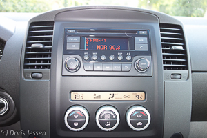 Trotz der breiten B-Säule ist die Rundumsicht gut. Ordentlich ausgestattet ist der Navara mit Ablagen aller Art: Flaschen, Becher und Smartphone finden in der Mittelkonsole Platz, dahinter, zwischen den Sitzen, gibt es ein tiefes Fach für CDs, in dem sich auch die 12-V-Steckdose befindet. Schließt man hier ein externes Navigationsgerät an (ein eingebautes Navi gibt es nur im Zubehör oder ab der Ausstattungslinie „Platinum“) und bringt es wie üblich mit einem Saugnapf in der Fenstermitte an, verläuft das Kabel direkt über die Mittelkonsole. Die Steckdose hätten wir uns daher eher in dem Ablagefach oberhalb des Automatikschalthebels gewünscht, wo sich auch der USB- und AUX-Zugang befinden.