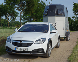 Der neue Opel Insignia Country Tourer, für Mit-Pferden-reisen.de im Test mit einem 2,0 CDTI Motor, 125 kW (170 PS) und Frontantrieb, ist ein schnittiges und doch bequemes Fahrzeug, das Pferdeanhänger bis 1,8 Tonnen ziehen darf. Das Fahrverhalten ohne und mit Anhänger ist sehr gut, wenn auch im oberen Bereich etwas mehr Agilität wünschenswert wäre. Mit 6,5 Litern im Drittelmix-Verbrauch liegt er im sehr sparsamen Bereich, mit Anhänger waren es nur 8,2 Liter. Der Einstiegspreis liegt bei 34.805 Euro, wobei – wie immer – zahlreiche Extras hinzukommen können.
