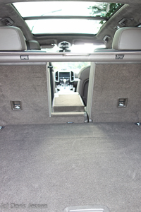 In Anbetracht der Größe brauchen sich auch Reiter mit umfangreichem Gepäck keine Sorgen zu machen: Die Ladeklappe ist elektrisch bedienbar, der Kofferraum per Knopfdruck praktisch abzusenken. Er fasst bei normal gestellten Rücksitzen 618 Liter bzw. maximal 1728 Liter und 662 Kilogramm Zuladung. Die Sitze sind ganz einfach 40:20:40 umzuklappen und haben in der Mitte eine Durchladefunktion für längere Gegenstände wie zum Beispiel Paddock-Stangen oder lange Gerten. Haken für Taschen gibt es keine, dafür kann ein Gepäcknetz über den Teppich-verkleideten Ladeboden an Ösen gespannt werden. Im doppelten Boden befindet sich anstatt eines Reserverades das Herz des Bose-Soundsystems.