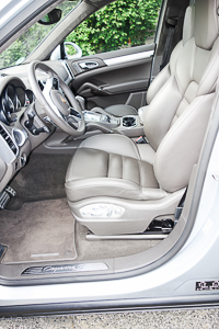 Über die verchromte Trittleiste mit Cayenne-Schriftzug eingestiegen, sinkt man in den superbequemen grauen Ledersportsitz, der den Körper umfängt wie eine maßgeschneiderte Schale. 18-fach sind sie – natürlich – elektrisch einstellbar und erinnern sich später auch an den programmierten Fahrer. Als Sonderausstattung ist der Fahrzeughimmel hier nicht mit schnödem Stoff bespannt, sondern mit ebenfalls grauen Alcantara, das dem gesamten Interieur ebenso wie die Aluminiumleisten eine angemessen noble Note verleiht.