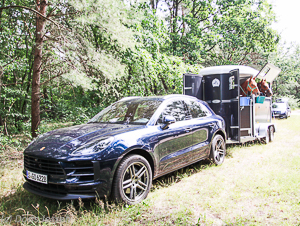 Bevor es allerdings zu unseren Pferdeanhänger-Fahrten kommt, muss die – in einem Fahrzeug dieser Klasse – natürlich vollelektrische Anhängerkupplung per Knopfdruck im Kofferraum ausgefahren werden. Direkt am Kupplungshals ist auch die Steckdose für die Anhängeelektrik angebracht. Mit Hilfe des scharfen Rückfahrkamerabildes, das mit seinen Führungslinien das punktgenaue Heranfahren an den Pferdeanhänger erleichtert, steht der Macan perfekt positioniert, ist in wenigen Sekunden angekuppelt und das Bremsseil in die mittlerweile in vielen Ländern der EU vorgeschriebene Öse (mehr dazu hier) eingehakt. Alles paletti, nun kann es losgehen.