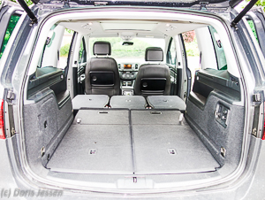Schon bei normal gestellter Rückbank ist der Kofferraum des Siebensitzers groß und bietet 658 Liter. Bei umgelegten Sitzen entsteht eine gerade Ladefläche mit maximal 2300 Litern bei dachhoher Beladung. Auch Großmutters Rollator oder die zusammengeklappten Regiestühle für den Turnierplatz dürfen mitfahren.