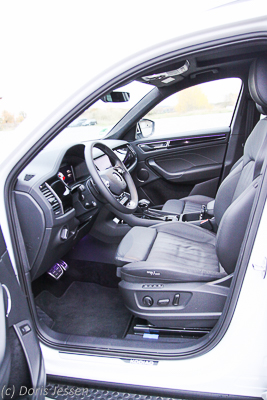 Obwohl der Einstieg SUV-typisch etwas höher liegt, braucht man die dominant wirkenden verchromten Trittbretter mit rutschfester Gummiauflage (optional 890 Euro) nicht wirklich, um auf den bequemen Ergo-Komfortsitzen Platz zu nehmen. Sie sind nach dem Facelift erstmals im Kodiaq erhältlich (optional 590 Euro) und tragen einen Bezug aus perforiertem Leder mit Kontrastnähten, sind beheiz- und belüftbar. Nach langen Ausritten genossen wir die Massagefunktion im Rücken- und Lendenbereich. Die Sitzfläche lässt sich bei Bedarf manuell verlängern, die integrierte Memory-Funktion speichert unsere persönlichen Einstellungen auf Knopfdruck.