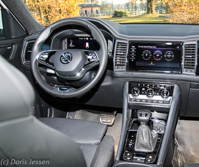 Im L&K-Modell finden wir das größte bei Škoda erhältlich Infotainmentsystem „Columbus“ (optional 1.990 Euro) mit einem 9,2 Zoll großen Touchscreen. Dank der integrierten eSIM ist es immer online und bietet neben digitalem DAB-Radioempfang optional auch Webradio. Auch Karten- und Software-Updates werden immer ‚over the air‘ eingespielt.