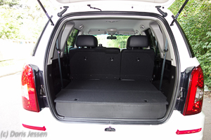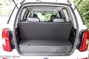 Sehr flexibel ist der Laderaum: Die kleinste Variante hinter der ausgeklappten dritten Sitzreihe bietet 250 Liter, Versenkt man die „Kindersitze“, dann ergibt sich schon eine Ladekapazität von 1.120 Liter von für Ross- und Reitergepäck. Diese wächst bei umgeklappter Rückbank (40:60 teilbar) deutlich, allerdings gibt es dazu keine offiziellen Werte. Grob gemessen dürften es rund 2.000 Liter. Die Ladekante liegt recht hoch, wofür gerade Großgewachsene aber sehr dankbar sind. Am hinteren Ende sind hier unter einer Klappe die abnehmbare Anhängerkupplung und das Werkzeug untergebracht.