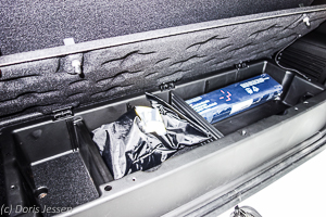 Die Ablagen sind brauchbar, aber nicht außergewöhnlich groß, so finden zum Beispiel nur kleinere 0,5-Literflaschen oder Becher Platz. Praktisch sind vorne kleine Stützen, in denen ein Smartphone aufrecht abgestellt werden kann. Die Mittelkonsole dient als Armlehne, darunter verbirgt sich ein Staufach. Das Handschuhfach ist wörtlich zu nehmen: Nicht einmal die – zugegebenermaßen dicke – Bedienungsanleitung hat hier Platz, dafür finden sich hier die vorgeschriebenen Warnwesten.