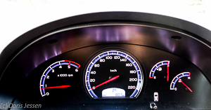 Der Diesel-Motor startet kraftvoll, allerdings noch mit Schlüssel, was heutzutage ja schon fast die Ausnahme ist. Die Instrumente – weiße Zahlen, rote Zeiger auf schwarzem Grund – sind übersichtlich und ohne besonderen Schnickschnack. Aufgrund von Reflexionen eher schlecht lesbar ist die Digitaluhr in der Mitte des Armaturenbrettes.
