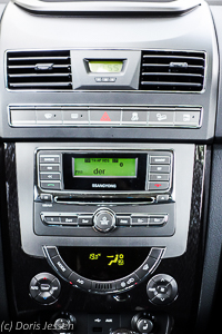 Am Lenkrad befinden sich die Steuerungen für die Audio- und Telefonanlage, deren Bluetooth-Kopplung und Audiostreaming vom IPhone einwandfrei funktionierte. Allerdings mussten die Geräte nach zwei oder drei Fahrten oft neu verbunden werden, was ein bisschen lästig war. Der Tempomat lässt sich mit einem Hebel selbsterklärend an der rechten Lenkradseite bedienen. In der Mittelkonsole finden sich in nobler Metall- und Carbon-Optik diverse Schalter für Heck- und Frontscheibenheizung, Parkpieper, Klimaautomatik und die Radio-CD-Kombination. Ein Navigationssystem hatte der Testwagen nicht, es ist aber optional erhältlich. Ein mobiles Navi lässt sich aber ganz einfach in einer der drei 12V-Steckbuchsen anschließen. Eine davon befindet sich praktischerweise in der Mitte des Armaturenbrettes gleich unterhalb des Fensters.