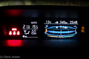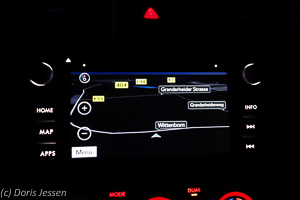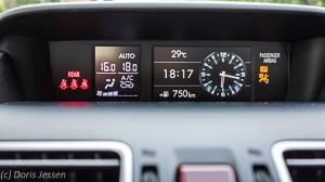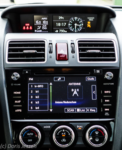 Oberhalb der Lüftungsdüsen erfährt der Fahrer auf einen Blick Innen- und Außentemperatur, vor allem mit der Uhrzeit hat man es besonders gut gemeint: Sie nicht nur digital ablesbar, sondern kann auch analog eingestellt werden. Außerdem ist man immer informiert, wie weit der Tank noch reicht. Unterhalb der Lüftung sind Audio- und Navigationssystem mit 7-Zoll-Touchscreen-Display untergebracht, auch hier alles auf einen Blick leicht erfassbar. Die sehr gut arbeitende Zweizonen-Klimatisierung und Ventilation ist per Drehschalter bedienbar, die Sitzheizung lässt sich auf Knopfdruck in zwei Stärken einste