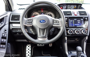 Per Knopfdruck gestartet, fährt der Wagen überraschend dynamisch los, da das Drehmoment von 350 Newtonmetern bereits ab 1.600 Umdrehungen zur Verfügung steht. Die sechsstufige „Lineartronic“-Automatik schaltet nahezu unmerklich und beim sanften Beschleunigen bleibt die Fahrt leise. Beim „Aufdrehen“ per Kickdown und kurz vor dem Schalten in den nächsten Gang tönt der Motor allerdings kurzfristig sehr hell, weil der Motor zur Beschleunigung in einen niedrigeren Drehzahlbereich herunterschaltet. In 9,9 Sekunden spurtet der Forester – soweit es die Verkehrssituation zulässt, dann von 0 auf 100 km/h. Jenseits der 100 km/h wird die Beschleunigung allerdings etwas zäher. Die Lenkung ist angenehm direkt und das Fahrzeug liegt bis an die 170 km/h satt auf der Straße. Das liegt u.a. auch an der tiefen Einbauposition des Boxer-Motors und dem daraus resultierenden niedrig liegenden Schwerpunkt. Das Herunterschalten der Automatik wird lediglich am Tourenzähler sichtbar.