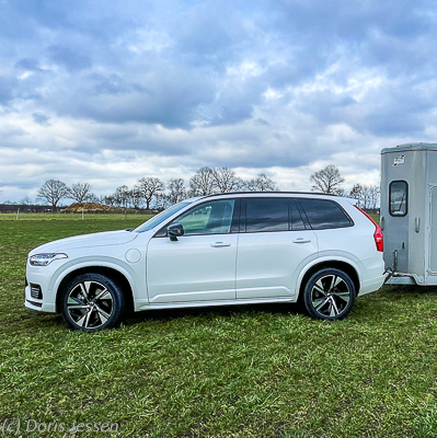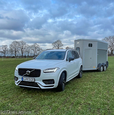 Das Plug-in-Hybrid Modell Volvo XC90 Recharge in der Ultimate Dark-Ausstattung ist bereits der dritte Schwede, den wir erfolgreich vor den Pferdeanhänger gespannt haben: Mit der Systemleistung von 335 kW (455 PS) und einem kombinierten maximalen Drehmoment von bis zu 709 Nm entwickelt das Premium SUV mehr als ausreichend Kraft, um 2,3 Tonnen nahezu unbemerkt vom Fleck zu ziehen. Dazu überzeugte das Fahrzeug durch sehr viel Platz für Passagiere und Gepäck. Mit rund 91.500 Euro für die Ultimate Dark-Serienausstattung ist man dabei.