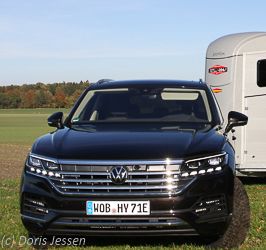 Der zweiwöchige Test hat bewiesen, dass mit dem VW Touareg eHybrid der Spagat zwischen Umweltschonung durch Grünstromnutzung einerseits und komfortablem Fortkommen in einem hochmotorisierten Premium-SUV durchaus gelingen kann. Wer also für seinen Pferdetransport ein starkes Zugfahrzeug mit 3,5 Tonnen Anhängelast braucht, über geeignete Stromlademöglichkeiten verfügt und viele Kurzstrecken fährt, ist mit dem VW Touareg sicherlich hervorragend unterwegs. Und wenn der Strom auf der Fahrt zum Turnier oder in den Reiterurlaub zu Ende geht, unterstützt die Rekuperation auch auf der Langstrecke beim Spritsparen. Der ganze Luxus hat natürlich seinen Preis: Für 74.250 Euro ist die schon sehr ordentliche Serienausstattung zu haben. Wenn’s wie im Testwagen ein „bisschen mehr“ sein darf, schlagen 99.856 Euro ein Loch ins Portemonnaie.