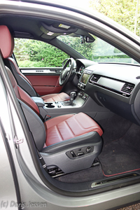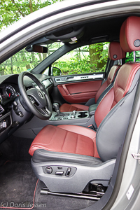 Aber den Touareg lediglich auf ein kraftvolles und funktionelles Arbeitstier zu reduzieren, täte ihm bitter Unrecht. Denn darüber hinaus ist er ein nobles SUV, das schon beim Einsteigen Lust aufs Fahren macht: Da zeugt der dezente Duft der Nappalederausstattung ebenso von gediegenem Luxus wie die hochwertige Innenausstattung. Alle Materialen sind grundsolide verarbeitet, mattiertes Aluminium, griffige silberfarbene Dreh- und Druckknöpfe und Klavierlackapplikationen haben eine angenehme Haptik. Die Türen öffnen sich schlüssellos beim leichten Umfassen des Griffes und schließen satt, nichts scheppert oder klappert. Zum Abschließen genügt ein Wischen über den Griff und, klack, alles ist versperrt,