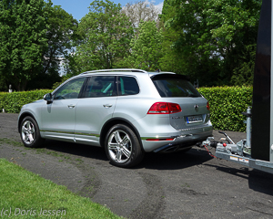Den Anhänger am Haken, geht es los zur ersten Testfahrt ins Ausreitgelände. Der Touareg zieht flott an, das Achtgang-Automatikgetriebe schaltet flüssig und nahezu unmerklich.