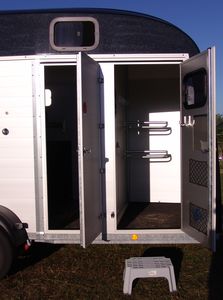 Der Boden besteht aus einer 21 mm starken Aluminiumprofilplatte, die mit einem 8 mm dicken Gummiboden fest beklebt und an den Rändern versiegelt ist. Einen zusätzlichen Schutz bietet im Bereich der Vorderbeine eine dicke Verschleißmatte mit Hammerschlagoberfläche, der auch mit Stolleneisen beschlagene Pferde nichts anhaben können. Links und rechts sind die Innenseitenwände durch 92 cm hohe Kunststofftrittschutzwände geschützt. Auf Hüfthöhe der Pferde ist außerdem ein weiches Seitenpolster aus schwarzem Gummi angebracht. Aufgrund der Innenlänge des Pferderaumes von drei Metern von den Heckstangen bis zur Wand haben die Pferde nach vorne gut Platz und auch der Mensch kann problemlos zwischen Bruststangen und Sattelkammerwand hindurchgehen. Für jedes Pferd gibt es einen eigenen Heunetzhaken, die mitgelieferten Futtereimer können seitlich an den Wänden eingehängt und zum Reinigen leicht aus den Halterungen entnommen werden. Oberhalb der Heunetzhaken leuchten zwei Lampen den großen Innenraum bei Dunkelheit gut aus.