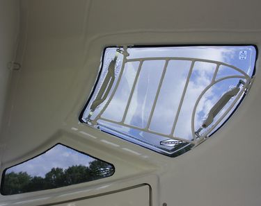 Und dann natürlich das auffallende Lichtkonzept! Die dunkel getönten Scheiben ziehen sich in einem optisch fließenden Band von der Mitte des Daches rund um den Bug. Die – nach Herstellerangaben größten – Aufstellfenster sind wie üblich in fünf Varianten zu öffnen. Davor lässt eine trapezförmige weitere Scheibe Licht zu den Pferden herein. In der Sattelkammer profitiert der Mensch von dem rundumlaufenden Lichtschein. Bleibt noch die Dachlüftung zu erwähnen, die den Pferden von oben Frischluft bringt.