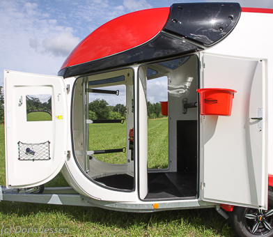 Die Inspektionstüren mit Dreipunktverriegelung sind ausreichend hoch, um erhobenen Hauptes einsteigen zu können. Sie sind wie auch die Sattelkammertüren durch kleine Saugstopper an der Wand zu arretieren. Diese konnten dem starken Wind in Norddeutschland allerdings nicht trotzen, die Türen klappten immer wieder zu. Als Notlösung haben wir die Sattelkammwertür mit einer Gummistrippe am Stützrad angebunden. Vielleicht sollte Böckmann hier eher die starke Magnethalterung einsetzen, wie wir sie an der Innentür der Sattelkammer gefunden haben.