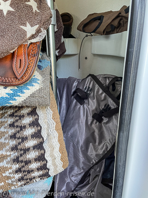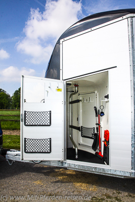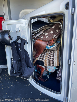 Die Kammer bietet nicht nur einen großen Stauraum selbst für größeres Turnier- oder Pferdereise-Gepäck, sondern ist zudem durch die sehr breite Außentür sehr praktisch zu beladen. Die Sattelhalter sind schwenk- und ausziehbar und einfach auf verschiedenen Höhen zu arretieren. Sie bieten auch großen Westernsätteln ausreichend Halt. Optional gibt es allerdings auch große Westernsattelhalter für den Aufpreis von 30 Euro.
