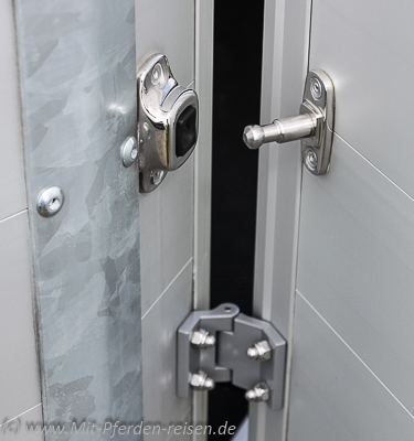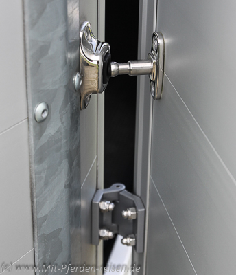 Soll die Trennwand einmal schnell ausgebaut werden, sei es für ein Verladetraining, den Transport von Stute mit Fohlen oder das Einladen großer Güter wie Stroh- oder Heuballen, kann dies mit dem neuen Exzenterspannner schnell vonstattengehen. Für Letzteres bietet sich auch die serienmäßige Klappe-Tür-Kombination an, bei der die Laderampe mit einem schnellen Griff geöffnet und als Tür zur Seite geschwenkt werden kann. Gegen ungewolltes Zufallen kann sie mit einem Haken außen arretiert werden.
