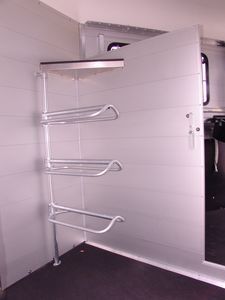 Keine Raumnot besteht in der Sattelkammer, die schräg im Bug angeordnet ist. Drei stabile Westernsattelhalter, fünf Haken für Zaumzeug, Helme oder Sporen, zwei Staunetze in der Tür sowie zwei dreieckige Ablagen oberhalb der Sattel- bzw. Trensenhaken sorgen für geordnete Verhältnisse. Aufgrund der Innenbreite des Anhängers von zwei Metern ergibt sich in der Sattelkammer ausreichend Stellfläche, so dass dem Transport von Futtertonnen oder Sattelcaddys nichts im Wege steht. 2,4 m Deckenhöhe erlauben selbst Paddockzaunpfähle oder anderes hohes Transportgut. In komfortableren Böckmann-Anhängern mittlerweile Standard sind Schaufel und Besen in entsprechenden Klemmhalterungen. Aucu hatte der Testanhänger eine beidseitig zu öffnende Tür zwischen Pferderaum und Sattelkammer (399 Euro), was beim Transport von drei Pferden schon praktisch ist, da man wenigstens ans erste und letzte Pferd leicht herankommt, sollte dies erforderlich sein.