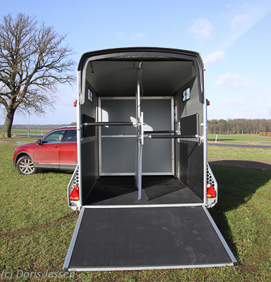 Der Einstieg wird vor allem für zögerliche Kandidaten durch eine Mittelpfostentrennwand erleichtert, deren Flügel sich ohne Kraftaufwand schwenken lassen. Im oberen Drittel besteht sie aus stabilem und Aluminium, unten ist eine flexible PVC-Plane angebracht. Sie trennt die beiden Vierbeiner voneinander, erlaubt aber dennoch das Ausbalancieren nach zur Mitte hin. Serienmäßig ist sogar das Kopftrenngitter. Für besonders streitlustige Pferde kann eine Kunststoffplatte als Sichtschutz eingeschoben werden.
