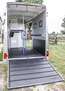 Humbaur schickte das Modell mit Rampe-/Tür-System (Option 335 Euro) und Vorderausstieg (Option 1.713 Euro) in den Pferdeanhängertest. Die Heckrampe, ausgestattet mit 8-mm-Gummimatte, Querstreben und Seitenstoppern, wird über die handelsüblichen Verschlusshaken geöffnet, gleitet leicht nach unten und liegt flach auf. Sie ist sehr stabil und verwarf sich auch nicht, als die Pferde darüber stapften.