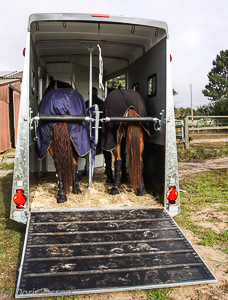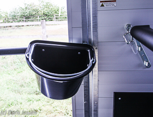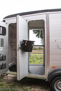 Möchte man die Pferde gleich neben der Kammer satteln, können sie an zwei sehr großen Ringen, durch die auch dickste Stricke Problemlos eingefädelt werden können, anbinden. Die Ringe dienen gleichzeitig zum Öffnen der von außen bedienbaren Panikentriegelung der Brust- und Heckstangen.