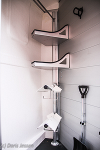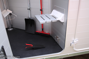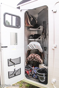 Ein Highlight des Modells Notos Xtra PRO ist ohne jeden Zweifel die begehbare Sattelkammer, die gleich zweifach beleuchtet ist: Einmal durch die Stromversorgung des Zugwagens und außerdem durch einen Batterie-betriebenen Bewegungsmelder: Sie hat eine hohe Einstiegstür, die mit einem leicht gängigen Schloss zu versperren ist. Die breiten und elegant weiß lackierten Westernsattelhalter sind an der dem Eingang gegenüber liegenden Seite montiert. Große Personen können beide Sättel von außen einladen, kleinere müssen für den oberen Sattel in die Kammer steigen. Oberhalb der Sattelhalter befinden sich über Eck montiert zwei Regalböden, wo Putzbeutel, Helme, Gamaschen o.ä. ordentlich aufgeräumt werden können. An der Stirnseite dient eine Stange zum Aufhängen von Sattel- oder Pferdedecken. Zwei Trensenhalter und diverse kleinere Haken für Sporen sorgen für weitere Ordnung. An der rechten Seite kann man sich auf einem ausklappbaren Sitz niederlassen, um etwa die Sporen anzuziehen. Sogar an den Stiefelknecht (platzsparend in einer Halterung untergebracht) hat Humbaur gedacht. Zum Verstauen von Hufkratzern oder Pferdepässen gibt es zwei Staunetze. Der darüber liegende Schminkspiegel ist für kleinere Personen etwas hoch angebracht.