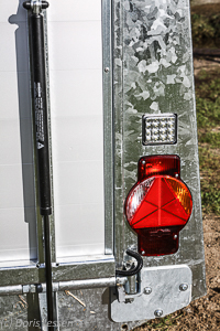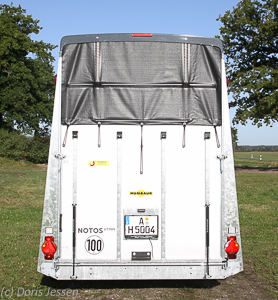 Die Beleuchtungskörper sind in vom Dach bis zum Boden durchgehende Heckstreben sicher eingebettet: Hier kann kein Pferdehuf in irgendwelche Spalten geraten. Eine dritte Bremsleuchte ganz oben am Dachabschluss informiert den rückwärtigen Verkehr über etwaige Bremsvorgänge.
