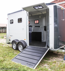 … steht er da. Der Aufbau aus hohen und 1,8 cm doppelwandigen Aluminiumprofilwänden, Polyesterdach und nahezu gerade geformtem Polybug ist auf einem feuerverzinkten Längsträgerfahrgestell mit Achsen von Knott verklebt und vernietet. Aufgrund der hohen Seitenwände bieten die Eingangstüren links zu den Pferden und in die Sattelkammer selbst Hochgewachsenen einen bequemen Einstieg ohne Risiko für Beulen am Kopf.
