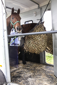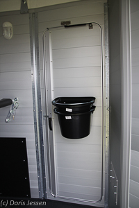 Für längere Fahrten empfiehlt es sich, den Pferden mit Heunetzen Beschäftigung zu verschaffen. Dafür sind für das links stehende Pferd zwei Ösen (zwei oben und einer weiter unten zum besseren Fixieren angebracht). Rechts oben an der Sattelkammerwand befindet sich eine weitere Öse, in der das Netz für das rechte Pferd aufgehängt werden kann. Allerdings haben wir dieses dann noch an der Bruststange verspannt, damit es nicht zu sehr ins Schwingen kommen.Das linke Pferd hat es hinsichtlich der Futtereimer etwas besser getroffen: Es kann in Ruhe aus dem Eimer fressen, der an der Innenseite der Inspektionstür befestigt ist. Rechts muss der Eimer an der genannten Stange eingehängt werden. Das ist nicht ideal, lässt sich aber machen.