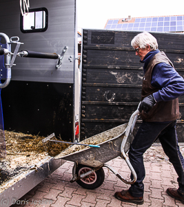 Für eine Maßnahme haben wir das Rampe-/Türsystem besonders schätzen gelernt: Am Ende der Fahrt sind üblicherweise mehrere Kothaufen am Heck zu entfernen: Diese kann man nun bei zur Seite geschwenkter Tür ganz einfach in die Schubkarre kehren. Die zumeist auch verschmutzte Rampe kann dann senkrecht stehend leicht mit einem Wasserschlauch abgespritzt werden.