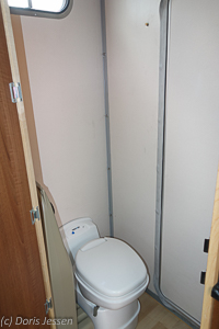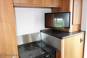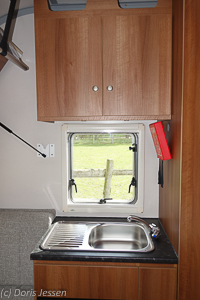 Für frische Luft sorgen ein Dachlüfter, zwei Klappfenster – eine große Panoramascheibe und ein Seitenfenster oberhalb der Spüle. Die abschließbare Eingangstür ist zweigeteilt, so dass der obere Teil ebenfalls zur Lüftung verwendet werden kann. Zudem gibt es ein Fliegengitter, das Luft herein, aber Insekten draußen lässt. Der Boden ist mit pflegeleichtem PVC-Laminat ausgestattet.