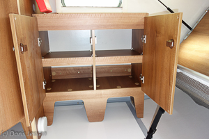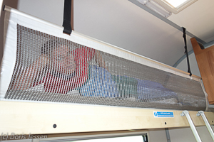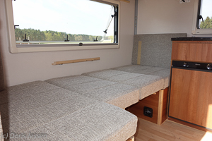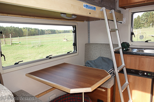 Aus den beiden Sitzbänken wird nach Absenken des Tisches ruckzuck ein gemütliches Bett, darüber kann, ähnlich wie im Schlafwagen, ein Etagenbett herunter geklappt und mit einem Netz gegen ungewolltes Abstürzen gesichert werden. Hinauf gelangt man über eine Leiter.