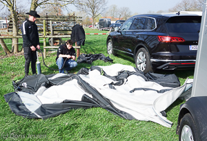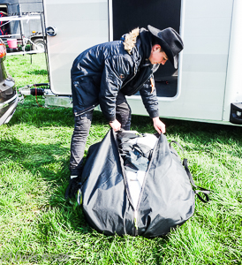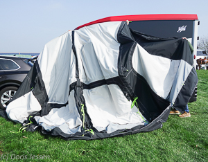 Westernreiter sind hilfsbereite Menschen und im Falle der Weltneuheit der HBX Awning auch noch neugierig. So hatte ich keine Probleme, die notwendige Unterstützung zu finden. Nachdem das etwa 25 kg schwere Zelt aus der Tasche gezaubert, auf dem Boden aufgelegt und das richtige Ende zum Einziehen in die Schiene identifiziert war, ging das Werk schnell erfolgreich von der Hand.
