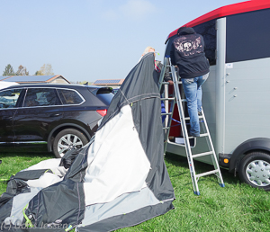 Ich war vor diesem Test zugegebenermaßen durchaus skeptisch, als mir Berthold Risse, seit 2008 Betreiber der Firma Trailer Point in Warstein und einer der führenden Händler der Marke Ifor Williams, das in seinem Verkaufsraum aufgebaute Zelt präsentierte und behauptete, es sei in fünf Minuten aufgestellt. Anhand des Abbauens erklärte er kurz die Vorgehensweise und entließ mich samt Klappleiter und neuem, brandroten HBX-511 Testanhänger in Richtung Turnier-Camping.
