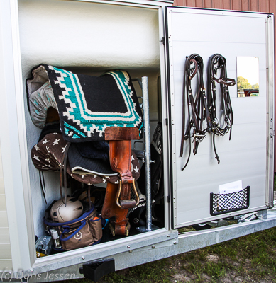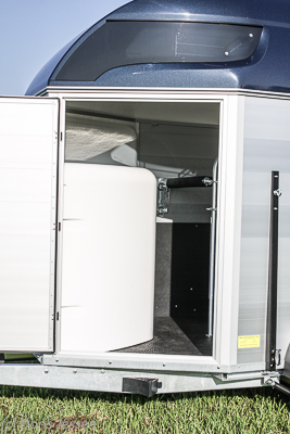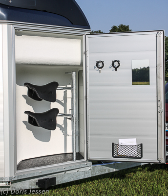 Beide Türen sind 95 cm breit und etwa 1,60 hoch. Diese Abmessungen finden sich selten so komfortabel. Das gilt vor allem für das Beladen der Sattelkammer mit großen (Western)sätteln. Sie sind bequem auf den nach außen schwenkbaren Sattelhaltern zu platzieren, passen satt hinein und hielten auch während der Fahrt sicher auf ihren Plätzen. Zwei Trensenhaken, ein Schminkspiegel und ein Staunetz sind an der Tür angebracht. Eine Gummidichtung verhindert lautes Türschlagen und Wassereintritt. Für dunkle Abendstunden gibt es eine Beleuchtung.